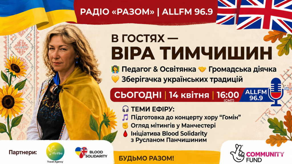 A recent live broadcast of Razom Radio on ALLFM 96.9 in Manchester brought together key voices of the Ukrainian community to discuss education, cultural identity, and humanitarian initiatives in the UK. The programme featured Vira Tymchyshyn, educator and community activist, and Ruslan Panchyshyn, Director of Ukrainian House UK CIC and initiator of the Blood Solidarity