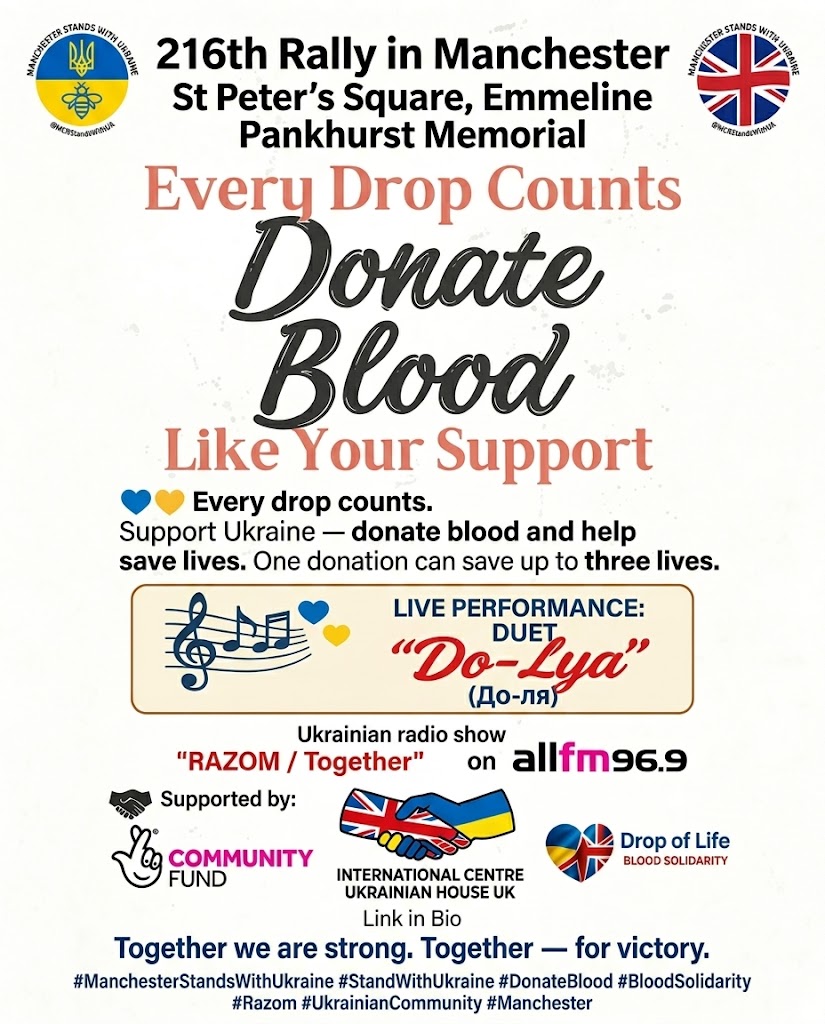 Запрошуємо на 216-й мітинг у Манчестері на підтримку України. 💙💛 Кожна крапля має значення.Підтримай Україну — здай кров та врятуй життя. Одна донація може врятувати до трьох людей. 🎶 Спеціальний виступ:Дует “Do-Lya” (До-ля) 📻 Інформаційний партнер:Українське радіошоу “RAZOM / Together” на ALL FM 96.9 🤝 За підтримки:The National Lottery Community FundInternational Centre Ukrainian House UKІніціатива